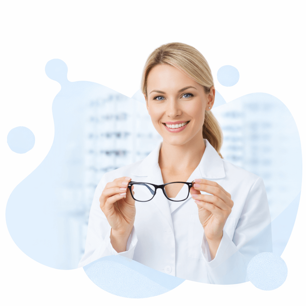 Professional female ABO NOCE certified optician with fair skin in modern optical shop holding glasses, warm confident smile, clean white/light gradient background