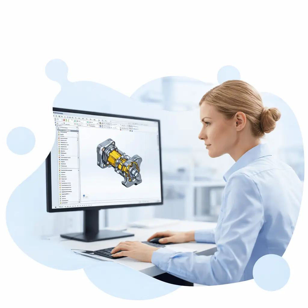 Certified SOLIDWORKS Professional with fair skin working at dual-monitor CAD workstation designing complex 3D mechanical parts