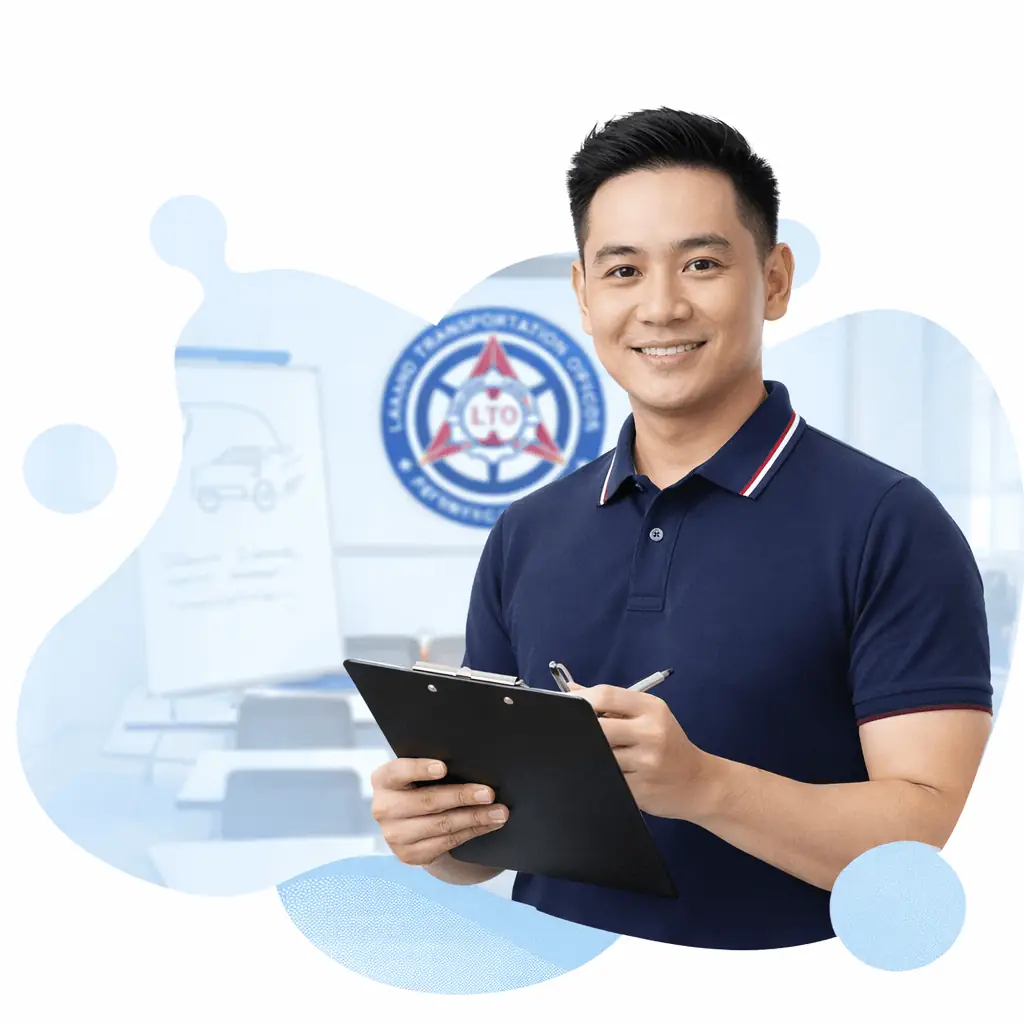 Professional Filipino driving instructor with fair skin holding a clipboard in a modern LTO classroom setting